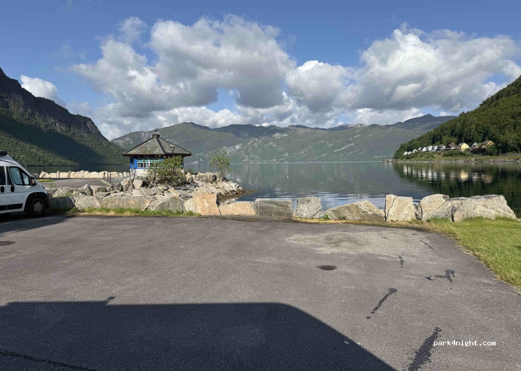 Schöner Ort mit tollen Blick auf den Fjord ! Einen Wasserhahn gibt es hier auch ! Abends kam ein Schiff, was die ganze Nacht sehr laut war ! Parkt am Rand, und lasst den Einheimischen ihren Anglerplatz frei !