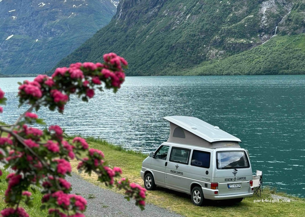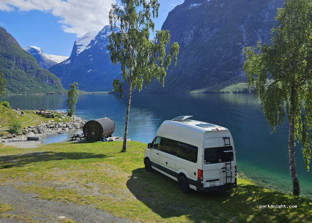 Die Anreise von Loen aus führt über eine einspurige Straße und könnte für größere Wohnmobile eine Herausforderung sein - aber die Aussicht am Platz ist jede Mühe wert. Auch der Übernachtungspreis von 400 NOK (WoMo inkl. Strom) rechtfertigt sich nur durch die Lage. Für die etwas abgelegenen Plätze direkt am See stehen Verlängerungskabel zur Verfügung. Wir kommen gerne wieder …