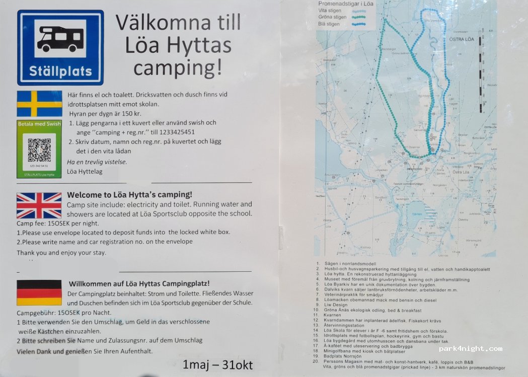 Dieser kleine, ruhige Stellplatz liegt idyllisch an einem Bach und zudem direkt gegenüber einer alten Eisenhütte, die besichtigt werden kann. Strom ist für sechs Mobile vorhanden. Das WC befindet sich ca. 150 m entfernt in einem nahegelegen Gebäude. Die Duschen werden etwas weiter entfernt beim Sportverein vorgehalten. Die Übernachtung kann bar mit einem Briefumschlag (liegt inkl. Stift bereit) & Swish bezahlt werden.