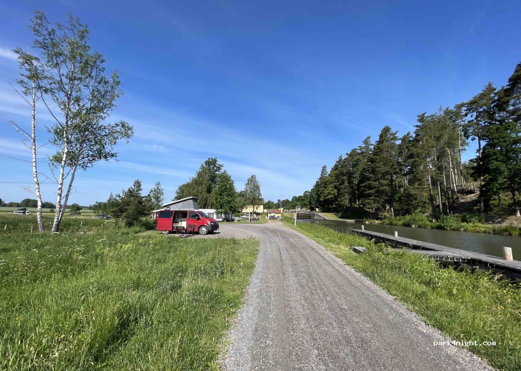 Wir waren für eine Nacht hier auf dem Weg nach Stockholm. Unser Navi hatte uns erst auf die andere Seite des Kanals geschickt. Ihr müsst vor der Brücke rechts den Schotterweg runter.
