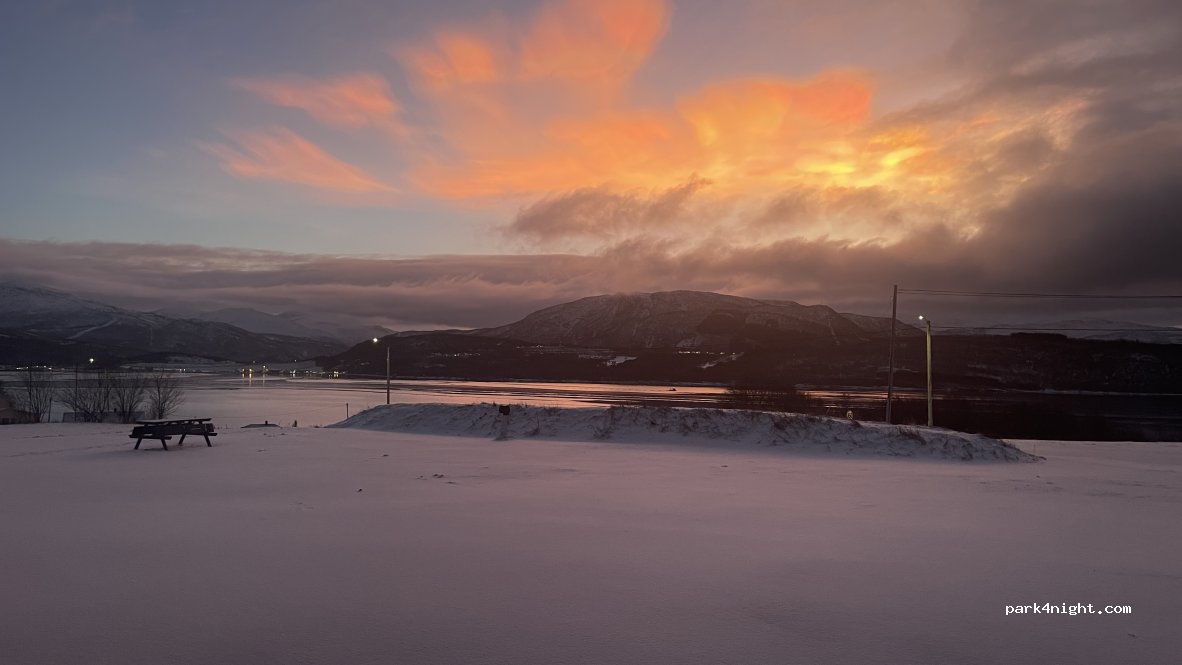 Platz sehr schön gelegen, wäre ideal, um die Nordlichter zu beobachten. Haben für Womo und 2 Personen 150 NK bezahlt. benötigen keinen Strom
