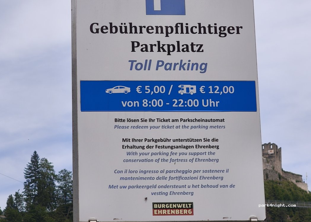 Passato 2 notti in questo parcheggio illuminato ed asfaltato su 3 terrazzamenti. Dalle 8-20 si paga la sosta per visitare il forte di Ehrenberg con la sua highline179....ma dopo le 20.00 il parcheggio è deserto e silenzioso. Perfetto!