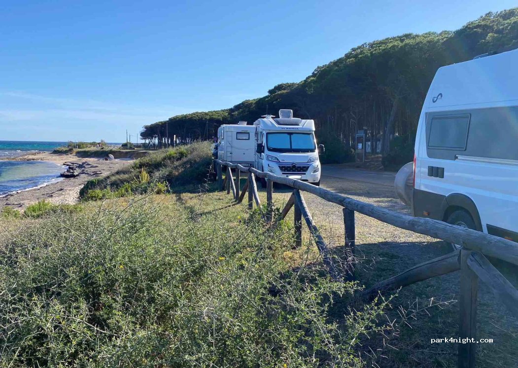 strada tranquilla (senso unico) che costeggia la spiaggia. poi 2 campeggi. posizione molto bella, spiaggia attualmente con molta posidonia. mare pulito. cartelli di posteggio senza alcun divieto camper.