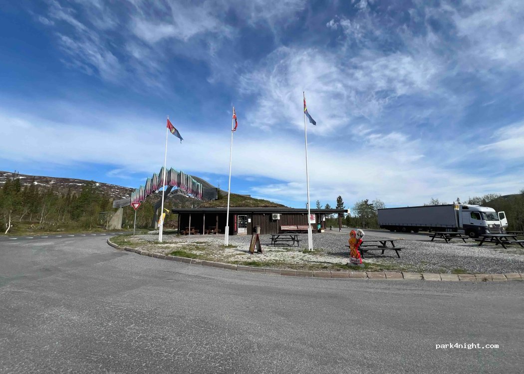 Parkplatz mit kleinem Souvenirladen am Eingang zur Provinz Nordnorge. Duschen (neu) auch ohne Übernachtung möglich (16.08.2024: 50nok/ pro Person).