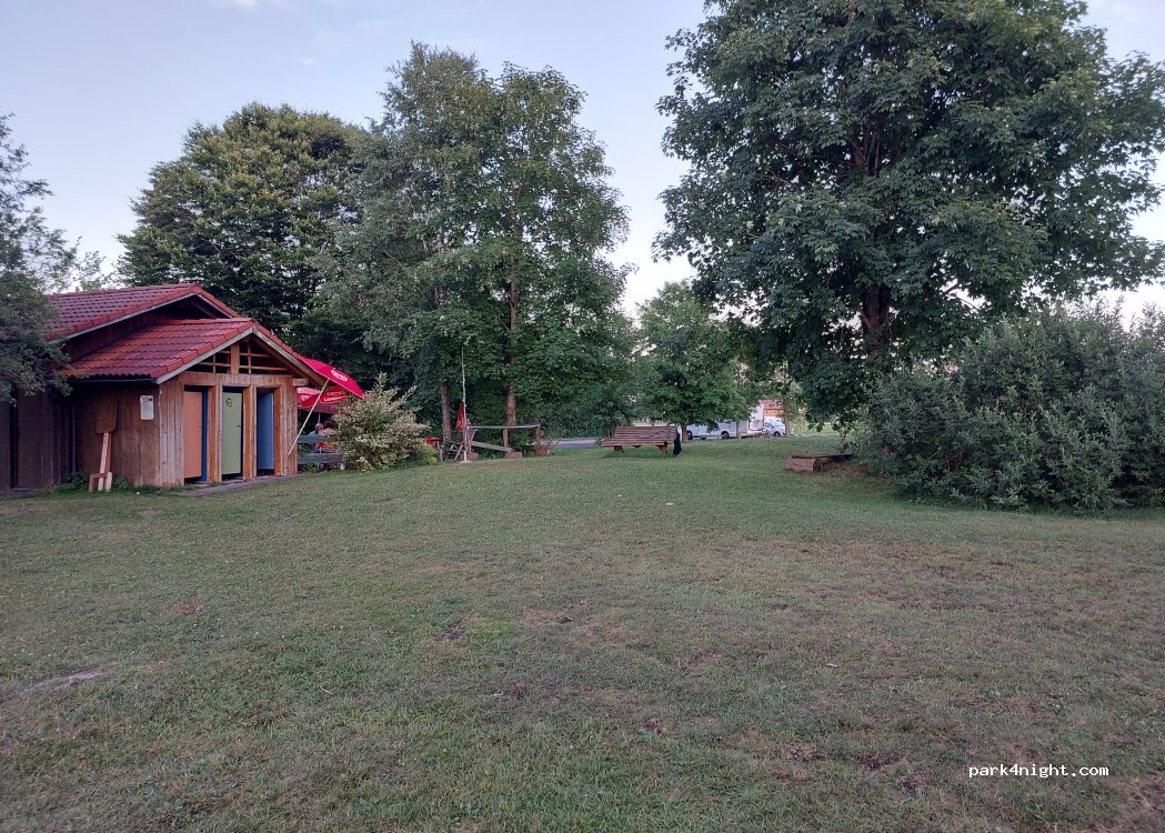 The parking lot near a small beautiful lake. Excellent for the reasonable cost of 15 €. Helpful person in the kiosk despite previous reviews. Many locals are here on a Sunday, but there's enough space for our 7.50 m motorhome. Clean toilet behind the kiosk. probably closed after working hours, Dixie toilet in the parking area. We would love to come again