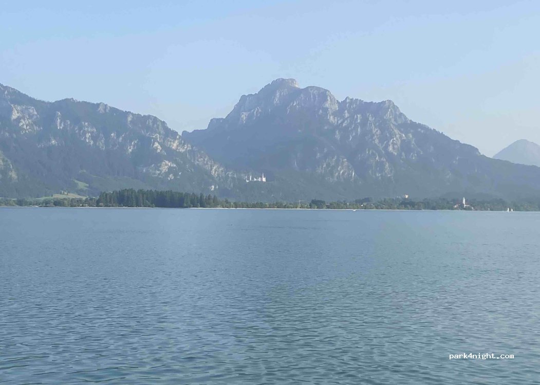 Camping au bord du lac avec vue sur les 2 châteaux de Louis II. Accueil agréable.Plus d’emplacement dispo alors on nous propose une place sur le parking à l’intérieur du camping en bord de lac : 14 euros la nuit pour 2 personnes et un van et une vue magnifique ! Sanitaires impeccables. Douche 3 min. 50 cts. Belle adresse !