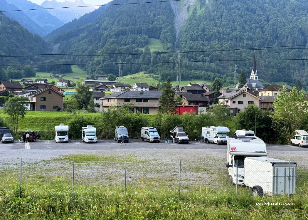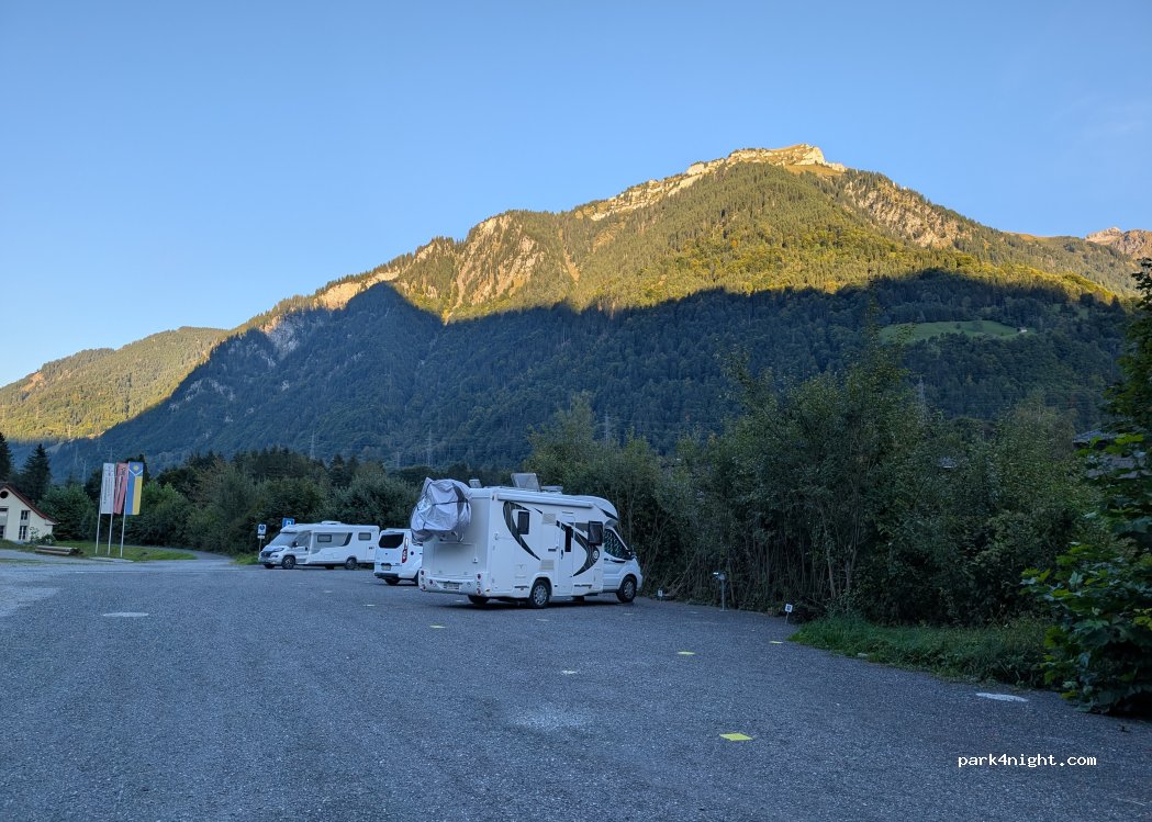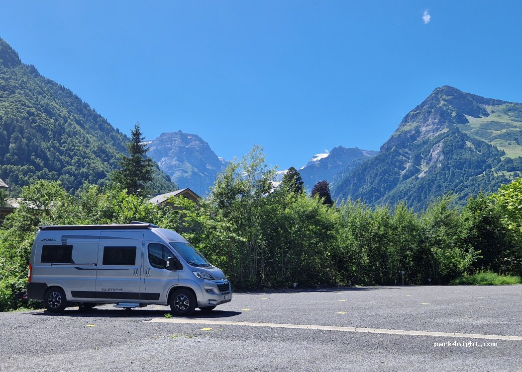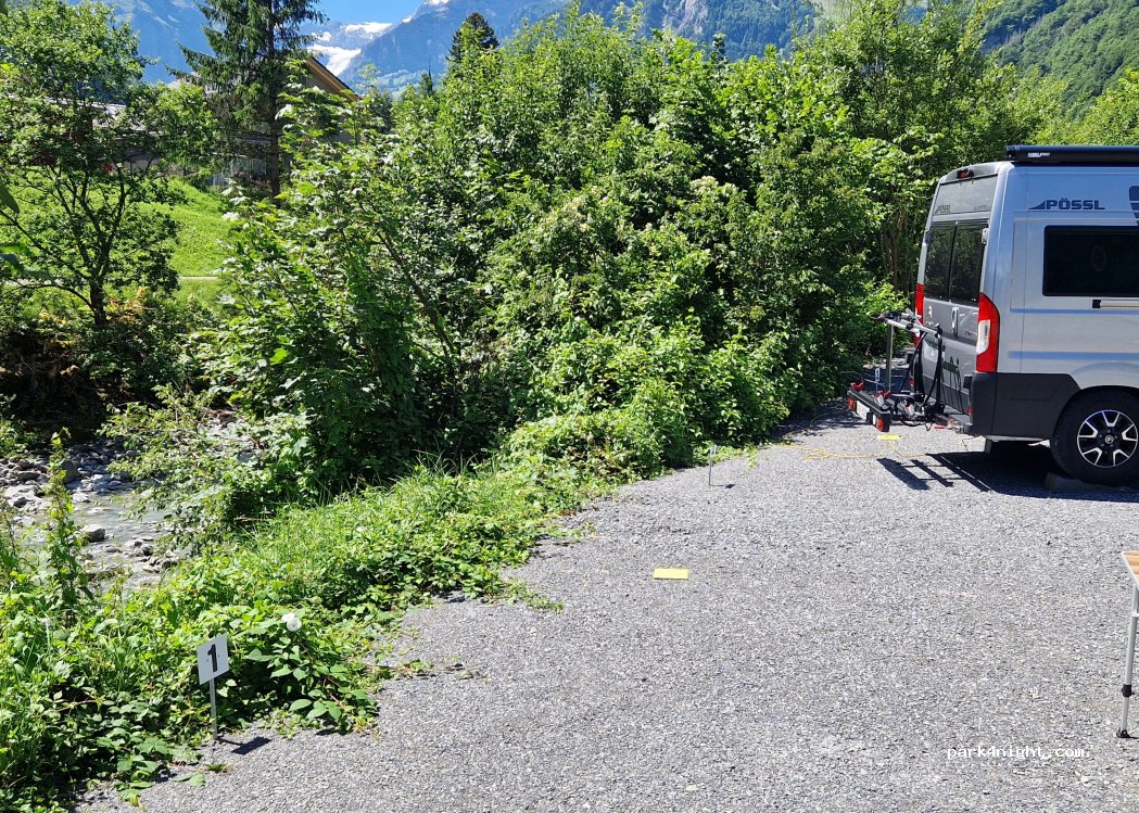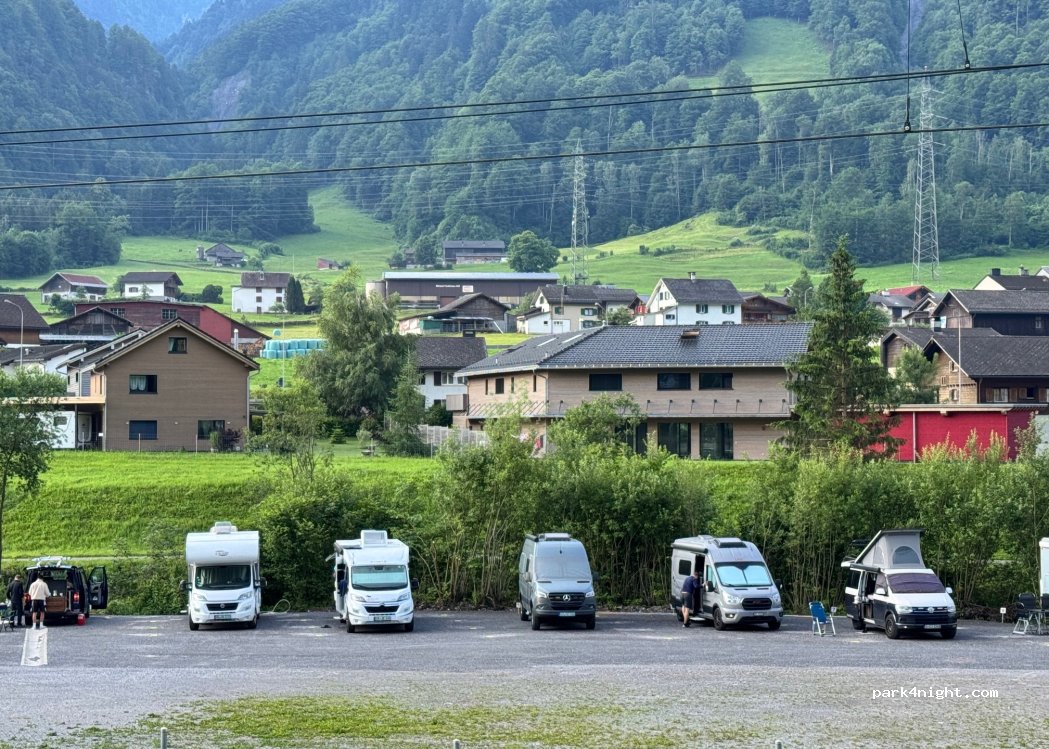 Y avons dormi deux nuits, environnement très calme (le train passe à proximité mais fait peu de bruit). Rapport qualité prix au top (5.- par emplacement/nuit + prix du parking (5.- les premières 24h puis 3.- par jour supplémentaire). Pas de service mais une borne se trouve à quelques km, sur l’emplacement répertorié à Glaris.
