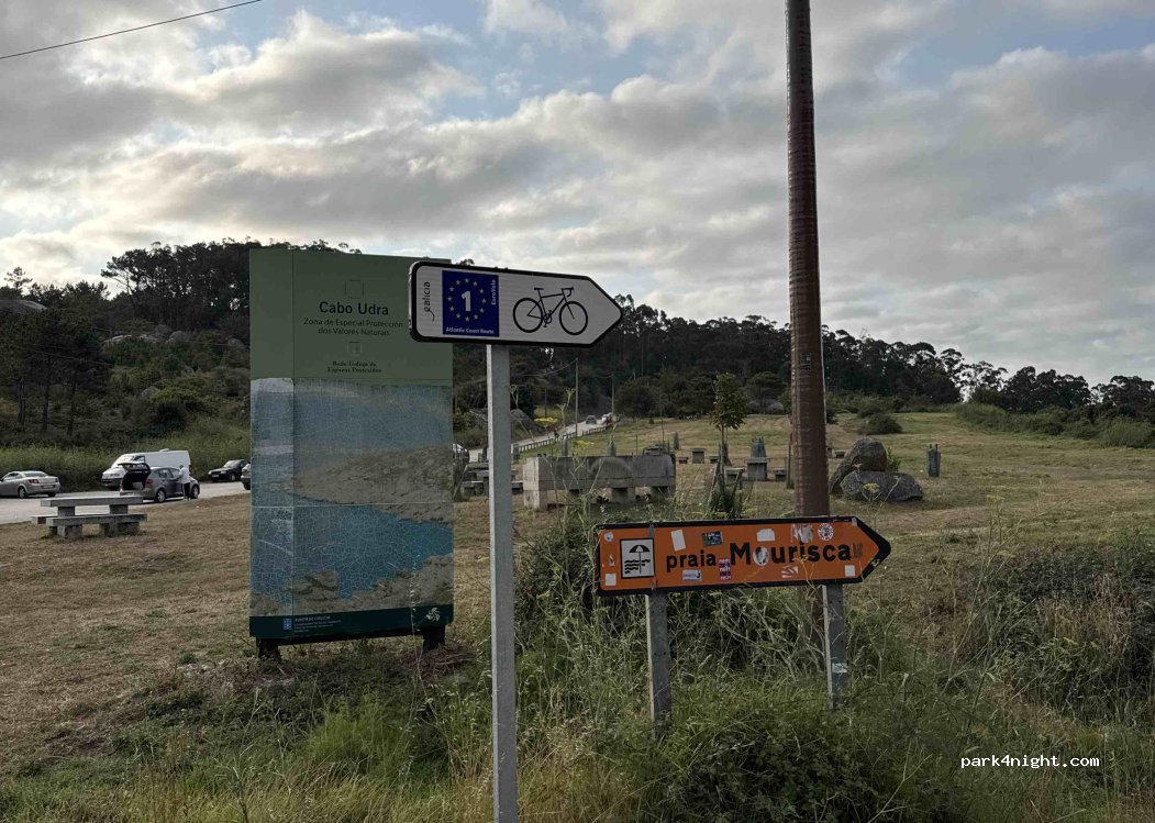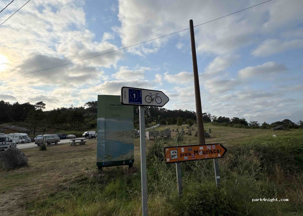 Lugar Idílico en el que desafortunadamente desde hoy no se puede pernoctar. Han puesto la señal de “Prohibido estacionar de 23:00 a 8:00, cualquier tipo de vehículo”. Que esto nos sirva para ser más respetuosos allá a donde vamos. El personal de la Xunta que ponía la señal nos dijo claramente que se debía al abuso que algunxs campistas hacemos, dejando nuestras aguas grises por el camino.