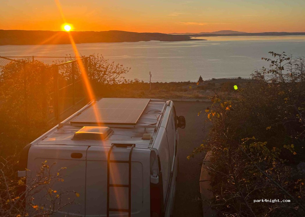 Parkplatz am Ende einer Sackgasse neben einem Gittergebäude. Direkt neben der Fähre zur Insel Pag. Wir verbrachten eine Nacht im Norden. Sehr ruhig, ungestört bis 10 Uhr. Einer der wenigen Plätze, die nicht am Straßenrand liegen und für viele Kilometer kaum sichtbar sind.