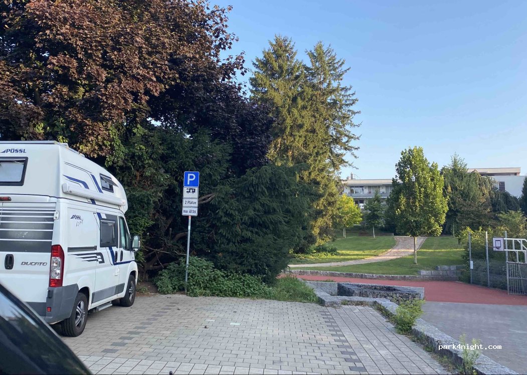 Es gibt nur zwei Parkplätze. Ich hatte Glück. Zu Fuß ist es nur ein Katzensprung bis in die Innenstadt. In Sichtweite ist ein schönes Schwimmbad. Für einen Parkplatz, der fast an der Innenstadt liegt, ist er ruhig und schön gelegen. Das parken hier ist kostenlos und man darf 48 Stunden stehen.