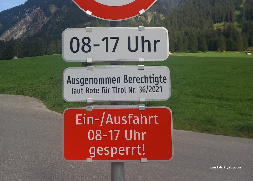 Die Übernachtung in Tirol außerhalb von Camping- und Stellplätzen ist nicht erlaubt. In Naturschutzgebieten darf nicht übernachtet werden. -> Der Stellplatz ist in Tirol UND in einem Naturschutzgebiet. Es ist wunderschön und, abgesehen von röhrenden Hirschen, ruhig. Es kostet 7€. Wer kein Problem damit hat, dass die Polizei kommen könnte,, übernachtet hier sehr gut.