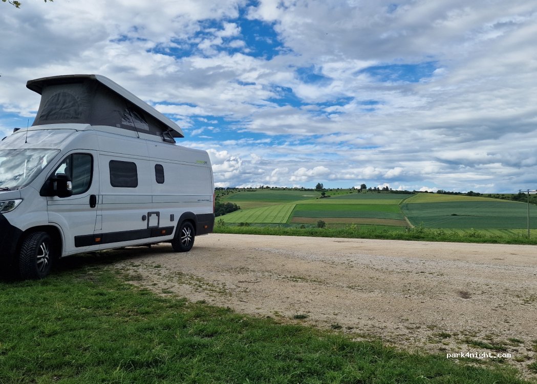 Ein Platz, wie man ihn sich wünscht. Ruhig, tolle Aussicht, ebene Stellfläche und sogar eine Picknickbank mit Mülleimer. Der mobile Empfang ist in Ordnung, aber nicht Spitze. Wir hatten hier eine erholsame Nacht. Ein Spaziergang zur nahe gelegenen Burg lohnt sich.