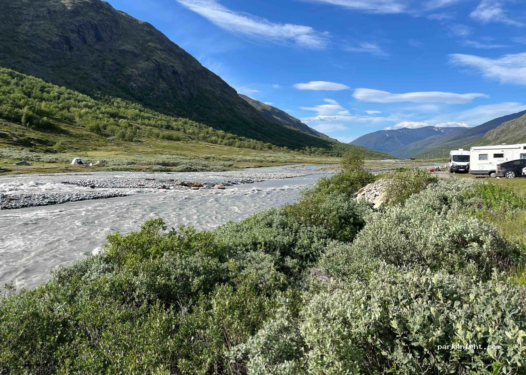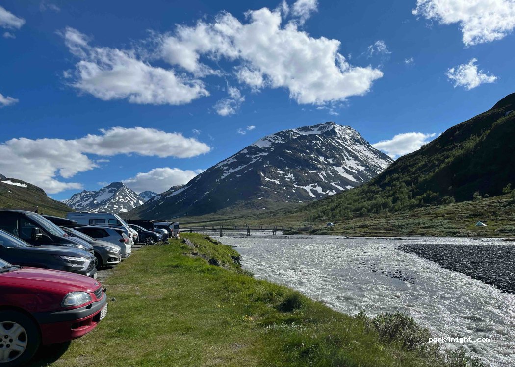 Accessible aux camping-cars. Point de départ idéal pour randonnée au Galdhoppiggen et Glittertinden. Route d’accès (16km terre battue) payante 150NOK et à une seule voie. Demander autorisation au préalable pour grand camping-car pour éviter de croiser bus et camion venant à contre sens. Parking 220NOK la nuitée.