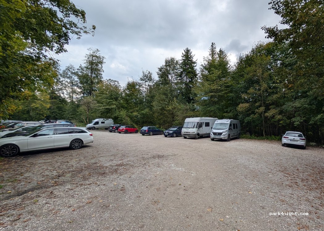 Parking gratuit relativement grand. Ceci est situé dans une forêt, donc les voitures sont à l'ombre pendant la majeure partie de la journée. Le stationnement est autorisé de 7 h à 21 h. Après cela, il y a une interdiction absolue de s'arrêter et de stationner. Ceci est également vérifié. Il y a des toilettes et un kiosque au bord du lac. Petits véhicules uniquement ; les plus grands pourraient avoir un problème avec la longueur du parking.