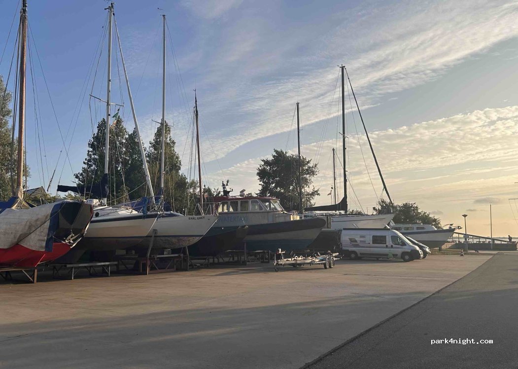 Quite nice spot. Not much to do unless you are into boats. Many parking spots - five up by the clubhouse on the sea quite near the harbour master, toilets showers washing up. Then a whole row further away on the other side of the harbour. Ideal for our one night stop on the way to Leek for bus in/out of groningen. 20 euros.