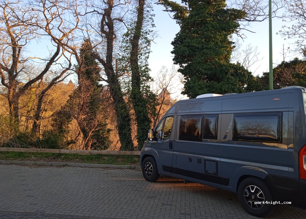 Schöner Parkplatz für 1 Nacht. Am Automaten ist Kartenzahlung möglich. Kurzer Fußweg um in der Stadt essen zu gehen oder die Burg zu besichtigen. Wanderwege in der Nähe.