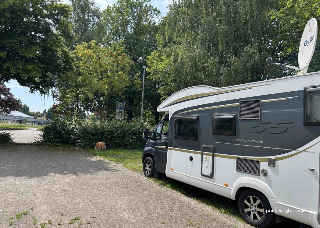 Free small parking space for 3 campers at the indoor swimming pool Syke, near tennis courts. Quiet place to stay in the countryside, on the daytime road in about 100m easily audible, next to it even more parking. Small restaurants on the square, I was not in it. In the village Europagarten invites you to visit in about 1.1km, MC Donalds also in place without service for campers