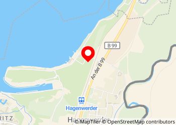 Großer unberechtigter Parkplatz oberhalb des Sees und dem Hotel der Sinne. Blick durch die Bäume aufs Wasser. Wir mussten keine Parkgebühr bezahlen.