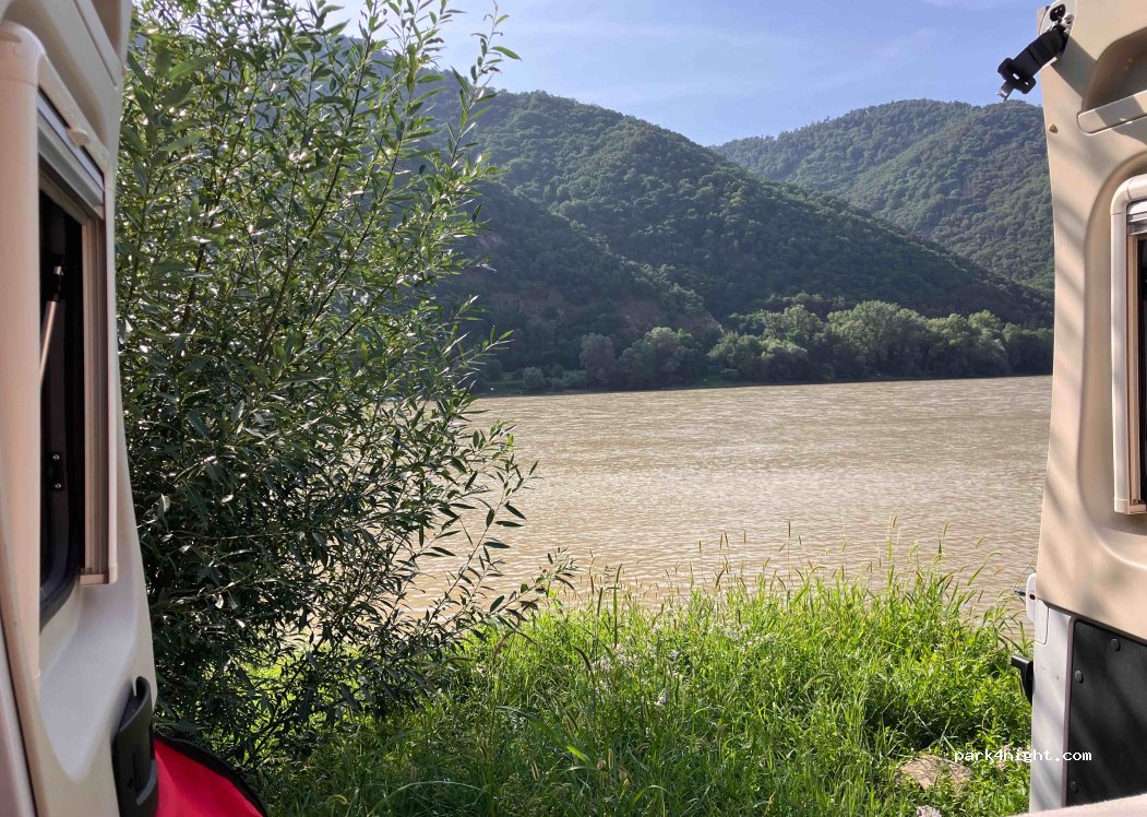 Toller Parkplatz. Mit Ausblick auf die Donau. Hauptstraße geht direkt vorbei in der Früh wird es laut. Toiletten ca 500m entfernt