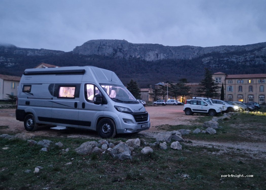 Grand parking bien à plat, j'y suis resté une semaine! Très calme et tranquille. Brasserie et office de tourisme avec Wifi gratuit, départs de randos! Petit point négatif en cette période (Octobre) il fait beaucoup plus froid et la météo est moins clémente que de l'autre côté du massif de la Ste Beaume.