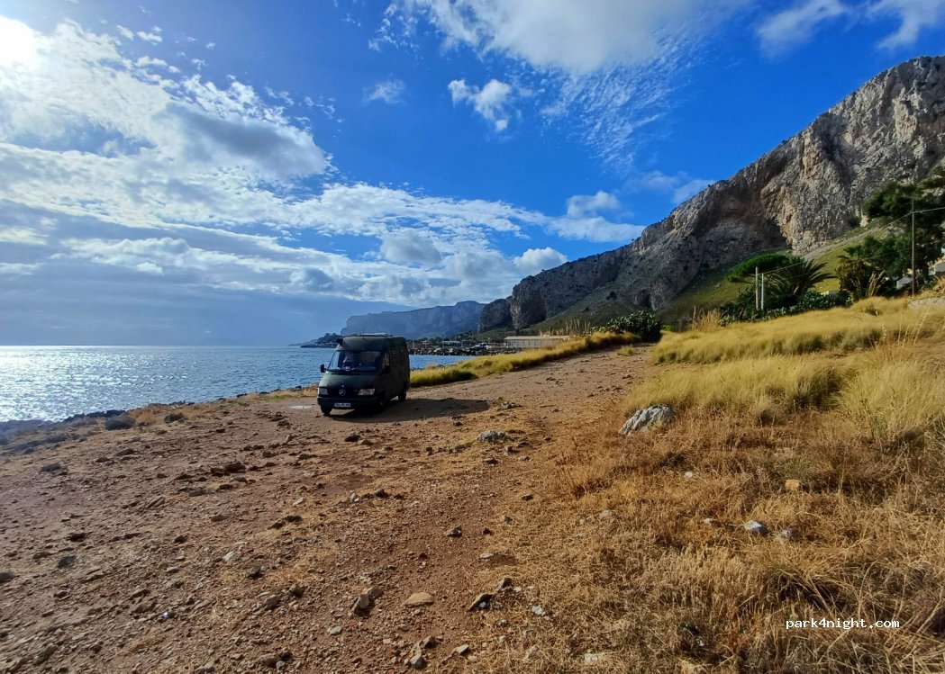 De weg ernaar toe is echt wel pittig met een smal weggetje vol gaten en bulten. Met onze Iveco Daily van 6,5 meter lang was het prima te doen. De plaats zelf is simpelweg een gravel veld aan de zee naast een jachthaven en voor vier huizen. Je hoort alleen de zee en ziet niemand in de avond. Geen faciliteiten in de buurt dus afval mee en voor een toilet 2km afleggen naar Mondello beach. Aanrader!
