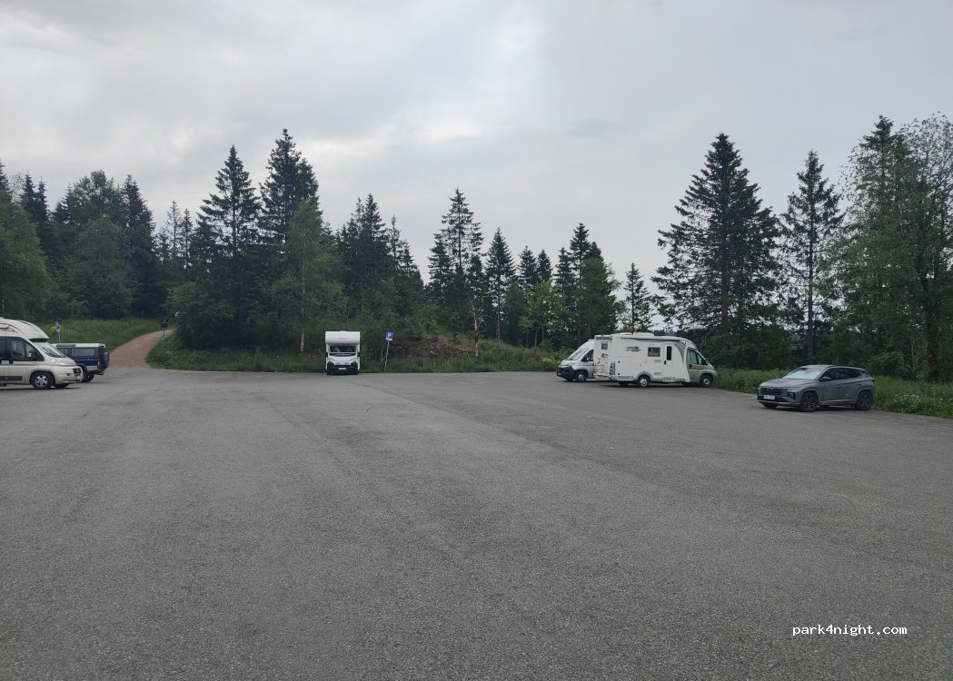 Parking plutôt plat au milieu des arbres. Pas de vue particulière. Calme. Départ de randonnées. Pas loin du tremplin à ski d'Oslo. Pas de services sauf des poubelles présentes.