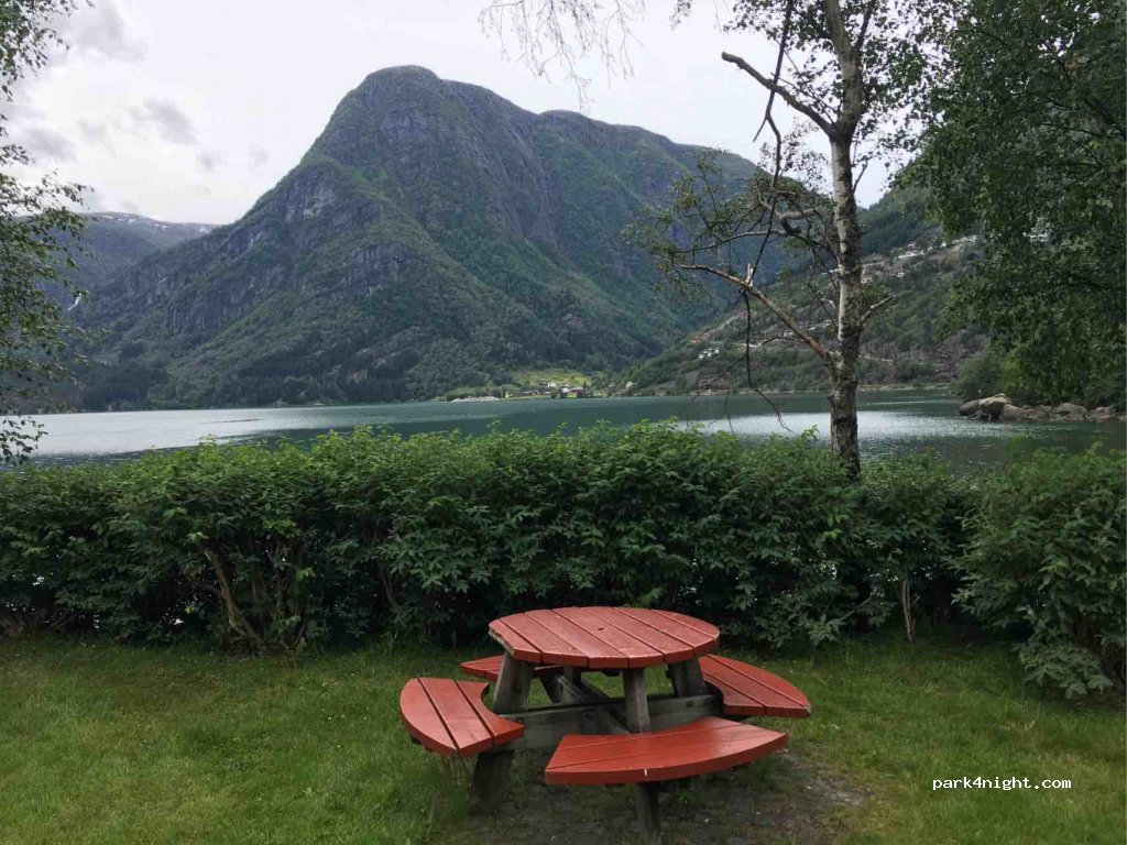 Parkplatz in Odda gegenüber dem Trolltunga Hotel. Neben dem Fjord gibt es Gras und Tische. Es gibt keine Toilette oder Wasser. Gegenüber gibt es ein Hotel und Häuser (daher gibt es nicht viel Privatsphäre), die Hauptstraße führt vorbei, obwohl man nicht viel hört. Wir übernachten neben 2 anderen Lieferwagen und einem Campingplatz im Garten