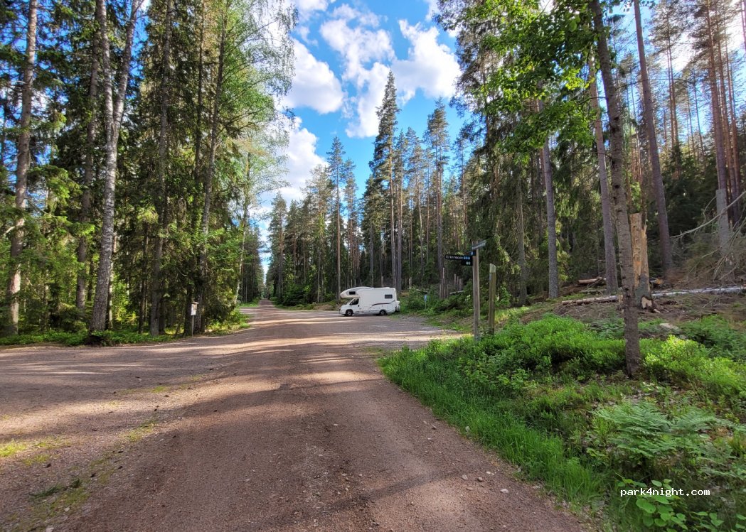 Parken am Zugang zum Norra Kvills National Park, völlig isoliert am Ende einer gut ausgebauten Schotterstraße mitten im Wald, herrliche Spaziergänge im Park, super Picknickplatz und eigenes Plumpsklo vorhanden.