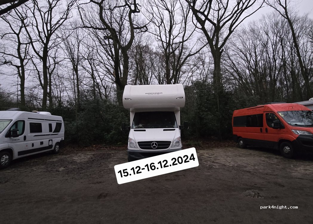 Camper (linkerzijde) en auto (rechterzijde) parkeren. Voorzieningen zijn 50 meter na de straat, net aan de linkerkant (nabij gebouw): water, afvoer van grijs water. Maximaal 72 uur, rustige locatie in bos maar naast weg. Elektrische voeding werkt niet vaak. Maak je WC niet leeg in het rooster aan de muur, dit is een keldergat! Do not empty you toilet in the grid at the wall, this is a basement!!!