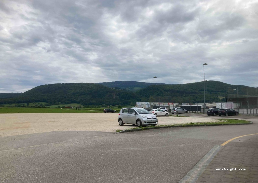 Endroit calme pour autant qu’il n’y ait pas de match. Jolie vu sur les champs et collines. Grande place à niveau, en gravier. Le plus: juste à côté des pistes cyclables et de randonnée