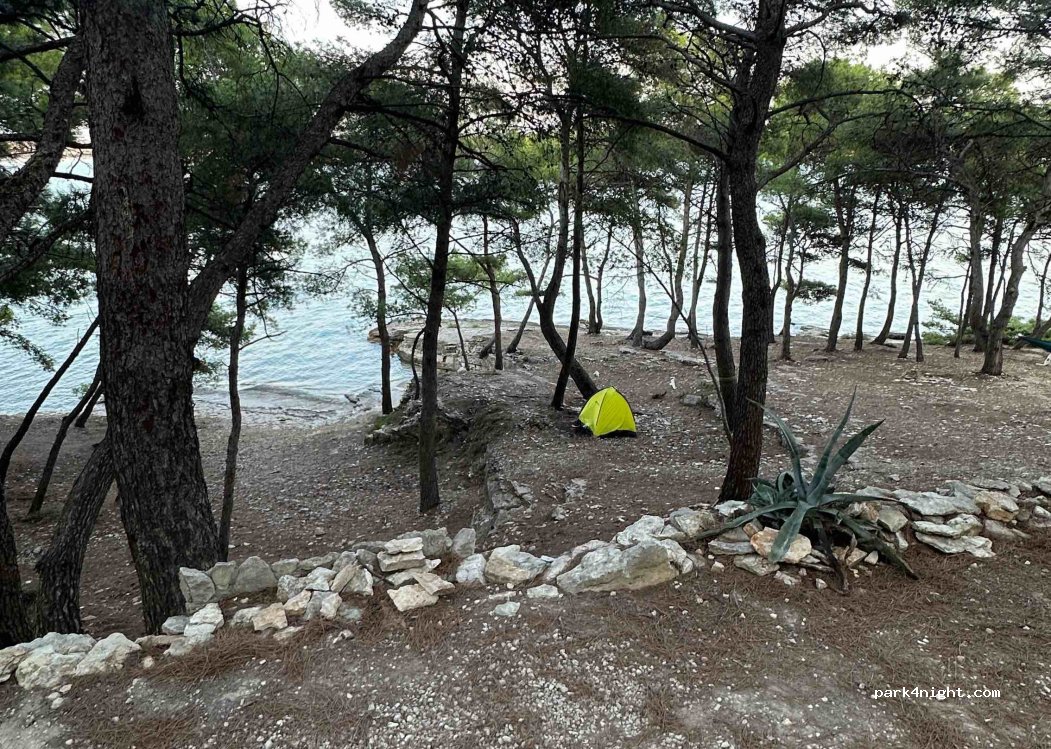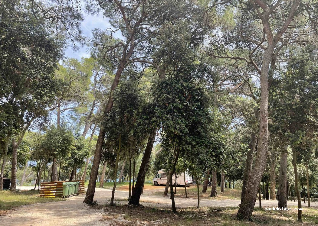 Sehr schön schattig im Wald. Aber auch schräg. Teilweise doppelte Klötze notwendig. Nachts hört man die Musik schon recht laut aber hat mich nicht so gestört. Wasser in der kleine Bucht warm und klar. Aber viele Boote. Strand ok auch für Hunde. Waldweg nach Premantura ok. Aber der Ort selbst kann nix. Von dort Taxi nach Medulin 180kuna. Kein Bus