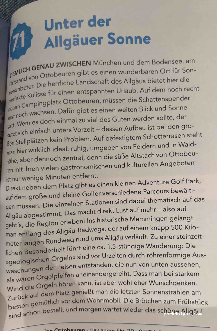 Große Stellplätze, alle mit Strom, Wasser und Abwasser ausgestattet. Top gepflegt, sehr zuvorkommende Betreiber. In 1,7 km erreicht man das nette Städtchen Ottobeuren. Die vielen Bäume sind leider noch nicht groß genug um Schatten zu spenden, aber das braucht halt seine Zeit. Schließlich ist der Platz erst vor 6 Jahren gebaut worden.