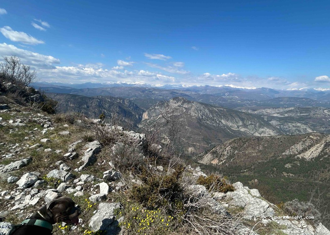 Grande place au niveau du belvédère. Vue magnifique sur les reliefs de l'Estéron et ses petits villages qui la nuit tombée s'allument comme des crèches. Voûte céleste à volonté. Mais endroit assez exposé aux vents venant de toutes les directions. On peut se mettre légèrement en retrait sous les arbres pour un peu se protéger. En ce moment, le soir, on a droit aux brâmes des cerfs dans les forêts environnantes, et ça dure toute la nuit.
