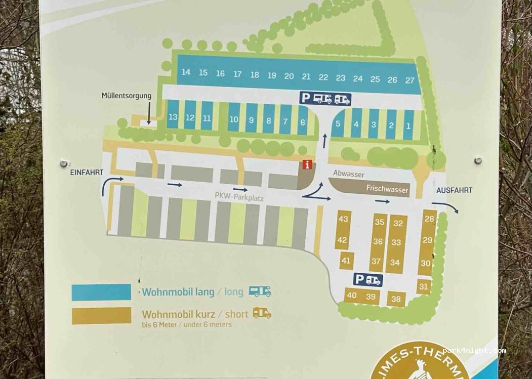 Thermes Limes camper place. Kurpark next door. Very quiet. Parking fees are to be paid at the spa reception. Supply/disposal immediately before departure. Also suitable for large mobile homes. The place costs 12 euros plus 2.10 euros tourist tax per person and from 6 nights - 9 euros per night. From 2 nights you get admission to the entire thermal bath for 24 euros.