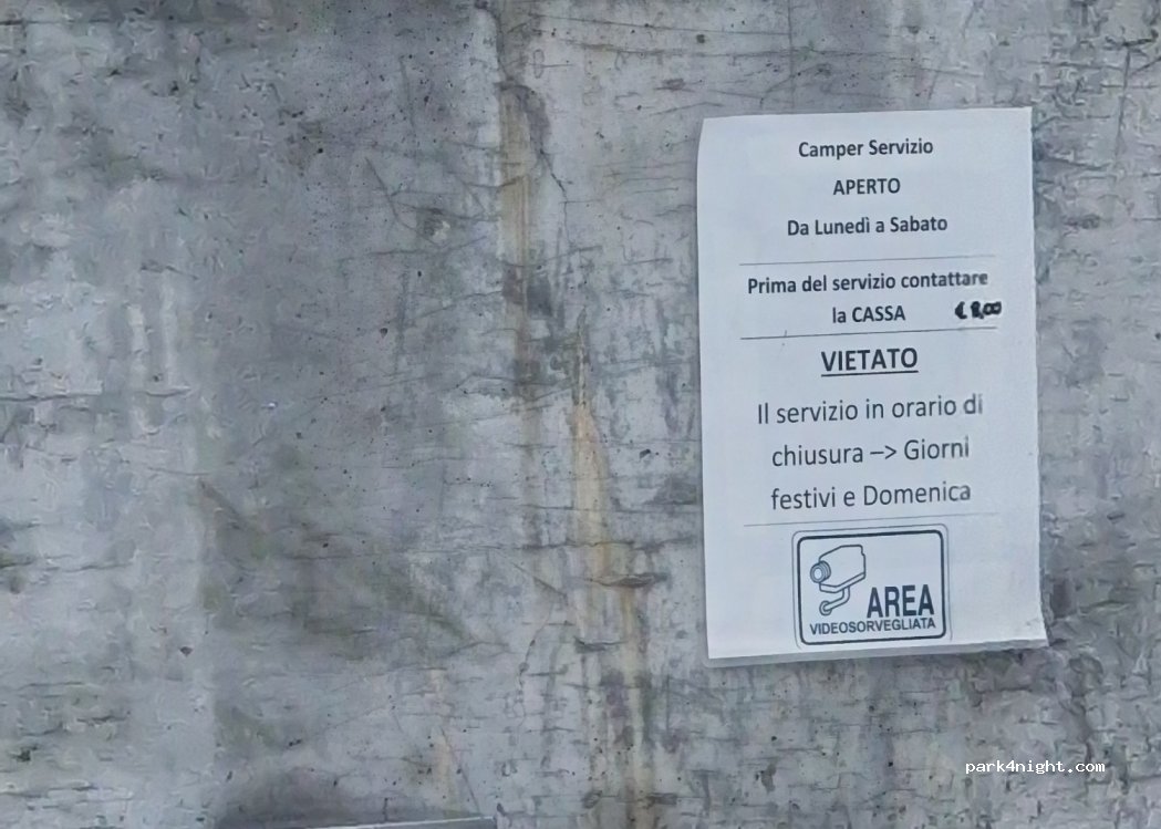 Servizi essenziali e funzionanti solo dal lunedì al sabato e solo dopo aver chiesto al gestore. Domenica e festivi è chiuso: noi di domenica abbiamo trovato un camion parcheggiato nella zona scarico, quindi anche volendo non avremmo potuto usarla - e penso che il camion venga volutamente parcheggiato lì!