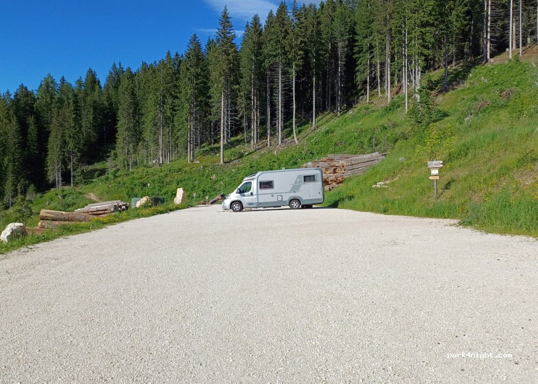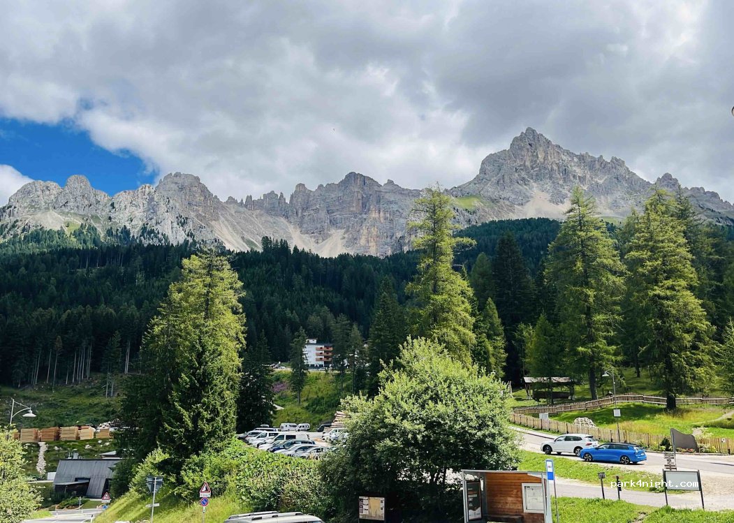 Hem passat la nit aquí amb altres furgonetes i autocaravanes, molt tranquils i vistes genials. No hi ha cap tipus de servei, però tampoc cap cartell que posi prohibició d'autocaravanes o de pernoctar. des del mateix parquing comença una caminada cap al llac de Carezzo ideal per fer amb nen@s o bici.