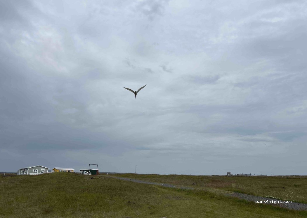 Große Wiese, feucht aber nicht matschig, entspannte Atmosphäre. In der Küche stehen viele Sachen zu verschenken. Enteneier zu verkaufen. Aktuell jede Menge Seeschwalben, die rund um die Uhr laut kreischen, mit Fischen im Schnabel rumfliegen, sich gegenseitig jagen und gelegentlich Scheinattacken auf Menschen fliegen.