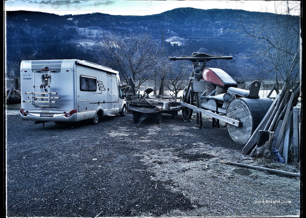 Der Parkplatz ist groß, geschottert und fast eben. Die Bundesstraße hört man kaum und man kann gut schlafen. Das Essen im Restaurant schmeckt wirklich gut und die Preise sind moderat. Wir wollten reservieren, aber der urige Chef hat nur gemeint: Das paßt schon. Kommt einfach. Hundebesitzer: Gleich anschließend gibt es eine große Wiese zum Gassi gehen.