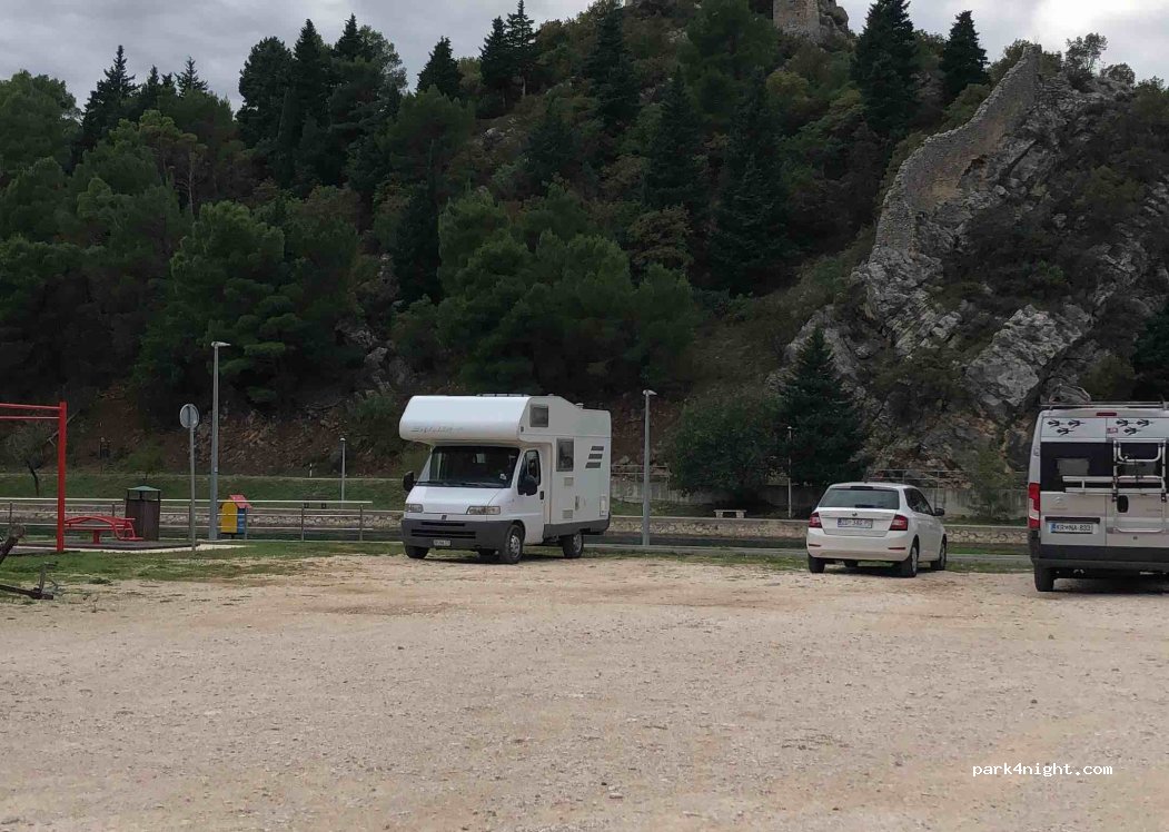 Easy to find, keep right once you pass INA and Konzum. Large carpark closeby toilet, shop and nice river when is hot. Also this town do have a free wifi so we did use it. This area under mountians is pretty windy so we were very glad for this spot not so exposed to Bora wind... We recomend to visit the river canyon 8km from here.