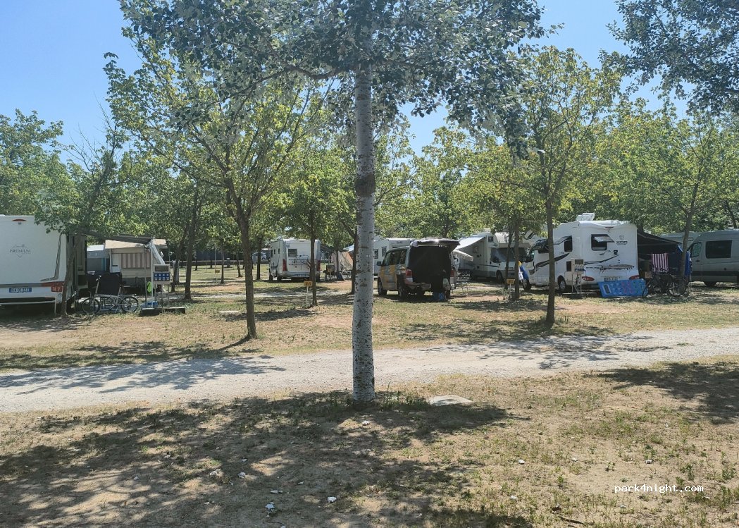 Area sosta camping Albatros, piazzole grandi ben disposte, pianeggianti, bagni e docce 10 lt a 50 cent. Sosta 24 h euro 22 in luglio Gestore cordiale e disponibile.