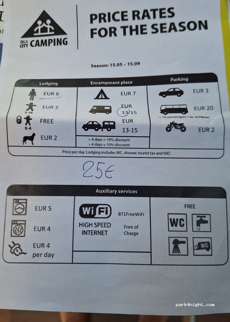 15 € pour un van/20 € pour camping-car, services compris. Attention, il est indiqué qu'il ferme après septembre donc se renseigner si vous venez hors saison. Camping les pieds dans l'herbe, installations propres et bien pensées, surveillé 24h/24h, idéal pour visiter Riga !