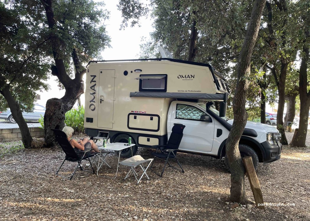 sehr netter Empfang. Unter Bäumen. Mit Keilen möglich, einigermasen gerade zu stehen. Direkt an der Strasse, aber Nachts sehr ruhig. Sehr saubere Sanitäranlagen. Der Strand ist zu Fuss, aber nur per Treppe, in 5 Min. erreichbar, kieselig aber sehr sauber. Hunde dürfen nur ganz früh dort baden.