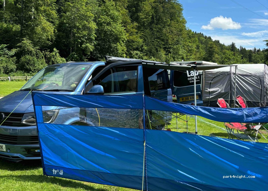 Just by the river, in between two forests and many hiking possibilities. Little shade, but very pleasant: ample pitches, friendly staff, clean toilets and washing up basins, little bar/restaurant (that we didn't use). Overall a very positive experience. You can hear the road above in the distance but not really disruptive. You hear the train during the day but not at night.