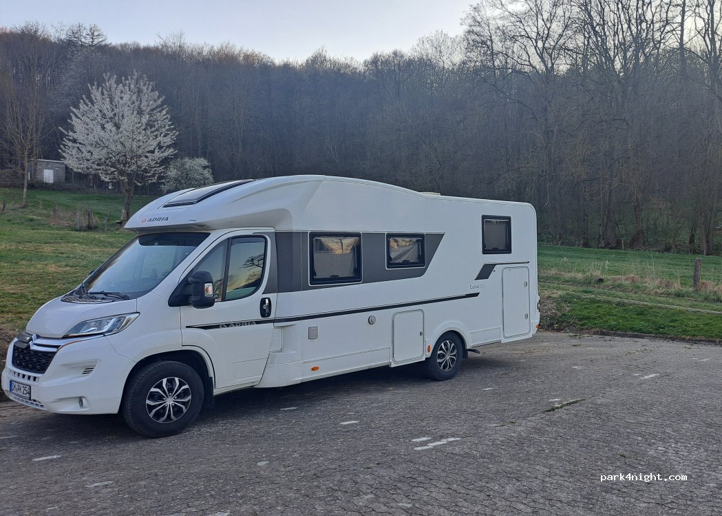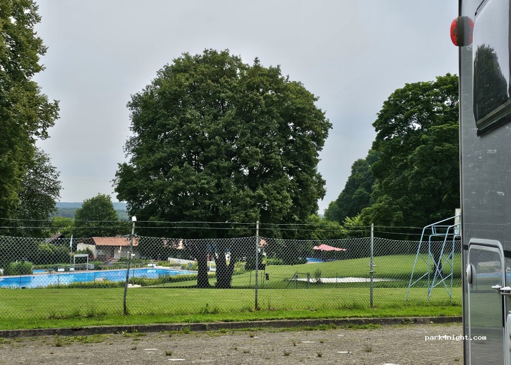 Parkplatz hinter dem Freibad, direkt am Waldrand und abgelegen, sehr ruhig und morgens nur Vögel und Kühe gehört - ein schöner Ort! Vereinzelt Jogger/Anwohner, aber sehr freundlich. Freibad öffnet um 9:00, heute (33 Grad) kamen die ersten Autos erst gegen 9:30. unbedingt erst ab der Mitte parken, dann sind die Plätze fast eben