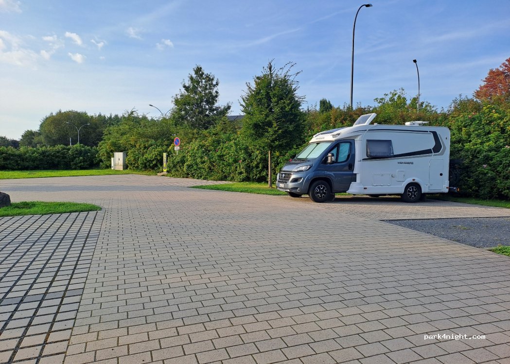 Parking sur la piste cyclable Vennbahn avec des panneaux d'information sur la région et un petit refuge. Poubelles et une station de charge pour les voitures électriques disponibles. Beaucoup de circulation pendant la journée, car le parking est sur la route principale, mais calme la nuit. Restaurant à côté.