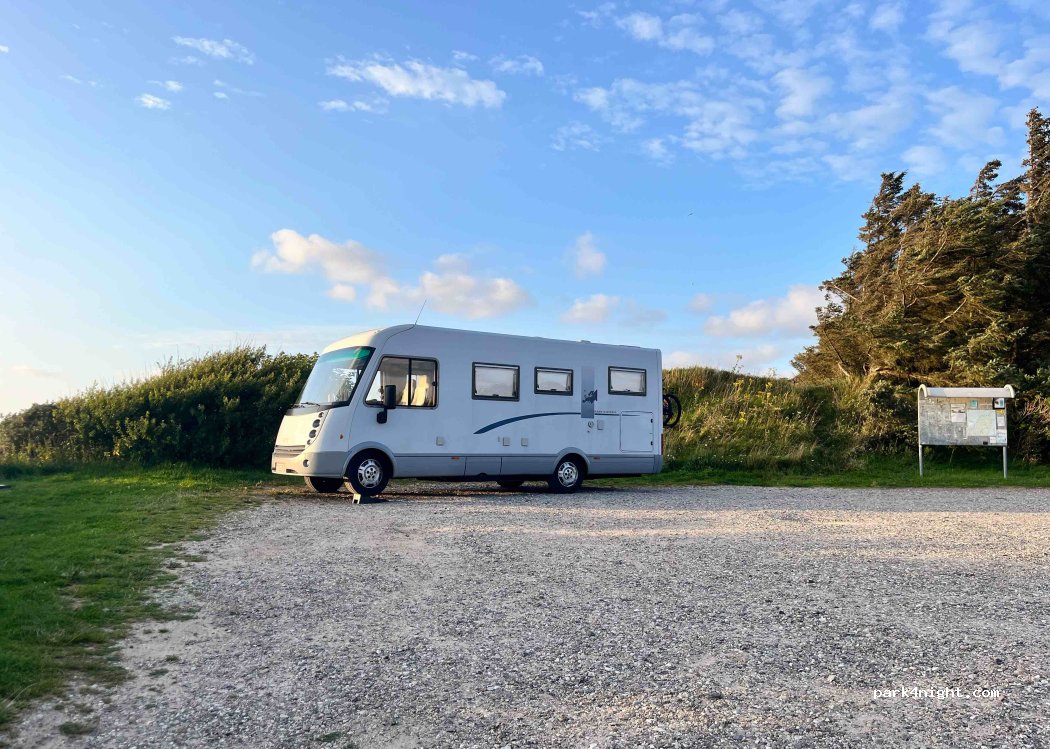 Un emplacement avec vue mer, nous étions 2 vans et avons pu profiter d’un beau coucher de soleil. Nuit très calme, route proche mais peu de passage pendant la nuit. Un conteneur poubelle qui dégageait des odeurs pas très agréables mais sinon vraiment bien.