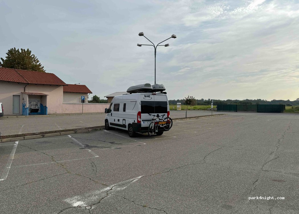 Parcheggio pubblico di videosorveglianza molto silenzioso. Nessun servizio per camper ma con fontana pubblica da bere (1 litro per 5 centesimi). Alimentari e bar della porta accanto. Molto vicino all'autostrada. L'abbiamo lasciata alla ricerca di un posto tranquillo in cui riposare e l'abbiamo trovato. Lo consiglio ma ti faccio un buon repellente per le zanzare ... c'è molta luce e si fanno notare.