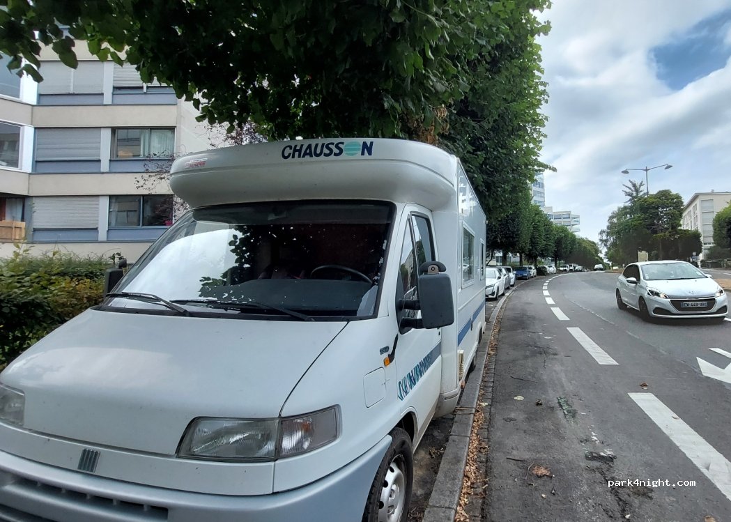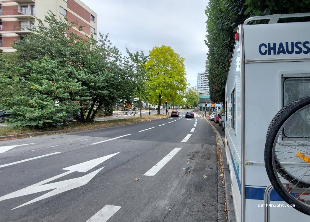 Les places le long du trottoir sont assez longues pour un cc de 6m de long. Pratique pour un stationnement gratuit mais pas pour y rester la nuit. Places des 2 côtés en descendant et en montant l'avenue.
