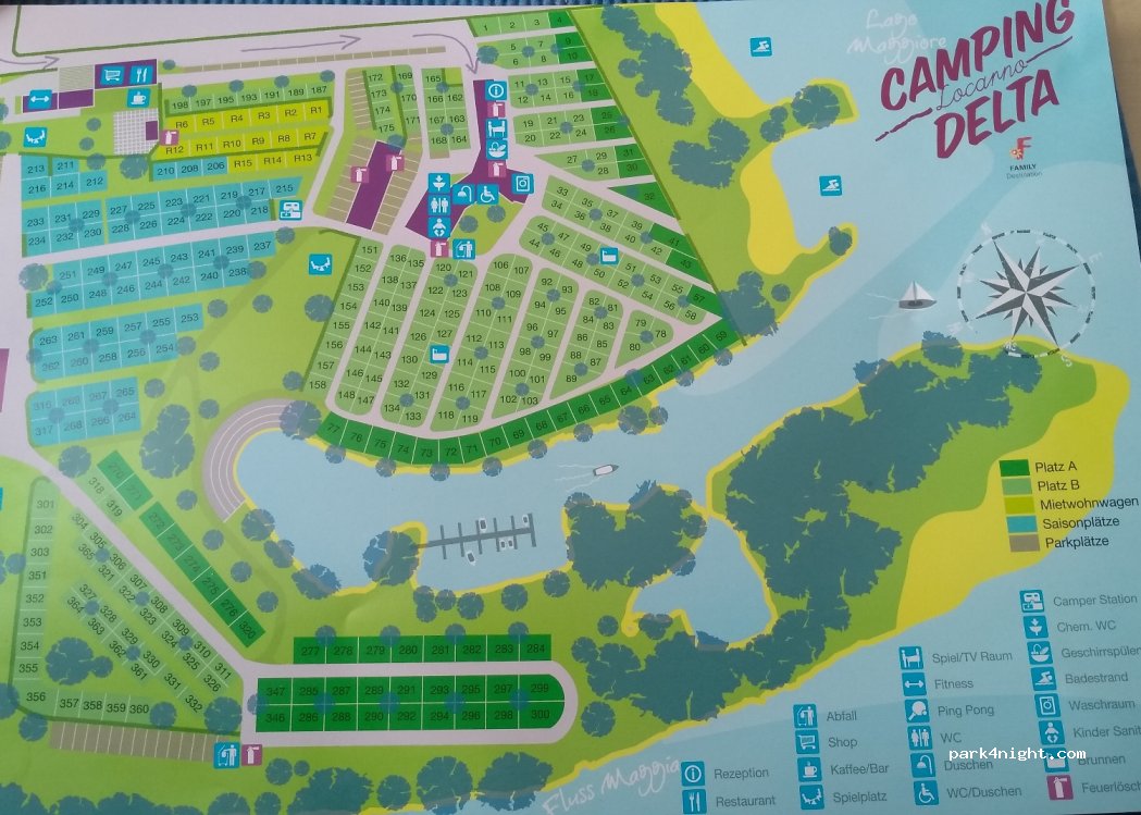 Wir kamen spontan, ohne Reservation für 3 Nächte.Nette zuvorkommende Dame an Reception, gab uns etwa 20 Plätze zum auswählen.Rest. und Shop auf Camp.Sanitär Anlagen immer Top sauber. Zum 2ten mal hier und kommen gerne wieder.Nach Locarno zu Fuss etw 20 Minuten.Ticino Tiket gratis erh. an Recetion, damit kann man gratis Bus, Schiff etc fahren.Tiket an Rec erh. 3N, 2P, 1C, o. El Fr. 152.40