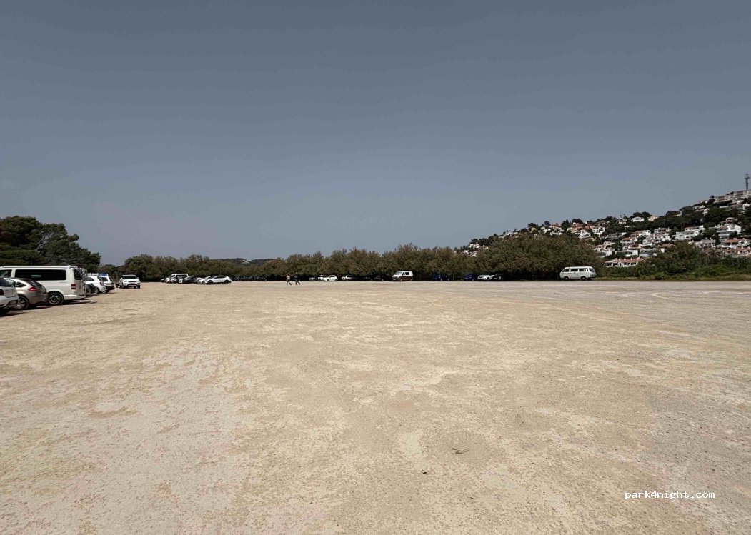 Este párking de tierra está en Zona Marítimo Terrestre. Se puede aparcar de día sin sacar nada, pero por la noche no puede estar ningún vehículo. La multa son 3.500€. Mejor aparcar en calles asfaltadas de la urbanización.